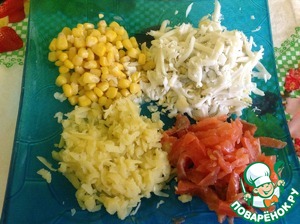 Яйцо и картофель трем на терке, с кукурузы сливаем лишнюю жидкость, семгу режем тонкими полосками или, если вам нравится, мелкими кубиками