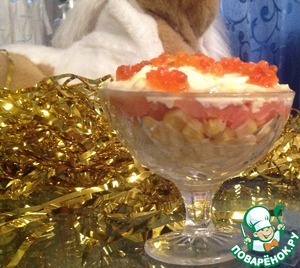 Сначала идет картофель, затем кукуруза, далее рыба, яйцо и майонез. Сверху украшаем икрой.