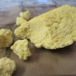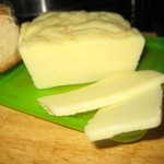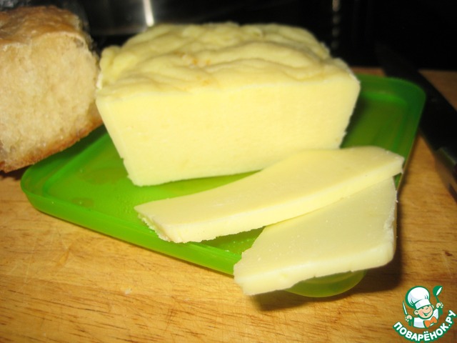 На фото разрез сыра, который постоял в холоде 4 часа. Смотрим на структуру. Идеально резаться такой сырок не будет и в дальнейшем, когда выстоится. Он даже может немного ломаться при нарезке, но зато способности к лепке у него всегда будут на высоте. Хотя, чем жирнее творог, тем красивее разрез у сыра. Что еще добавить, если сухой творог -- сухой сыр, если кислый творог -- кислый сыр.