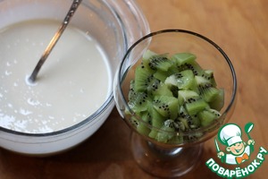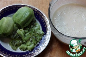Киви почистить. 2 штучки нарезать кубиками, оставшиеся - кружочками - для украшения.
