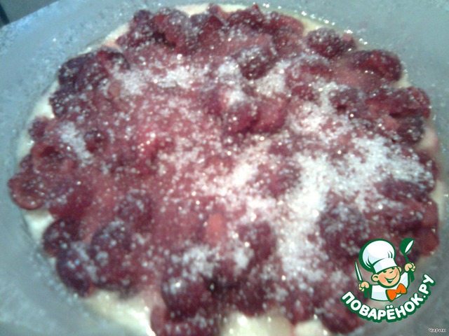 Половину теста влить в разогретую и смазанную сковороду (форму любую,но не высокую),положить слой вишен без косточек,посыпанных сахаром