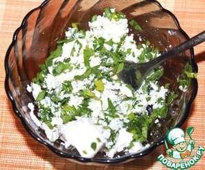 Для начинки кармашков сыр фета смешиваем с мелко порубленной зеленью
