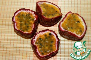 Маракуйю разрезать пополам. (Кстати, на этом этапе необязательно использовать столь экзотический фрукт. Прекрасно подойдет виноград, нарезанный колечками, мандарины или апельсины. Я делала со всеми этими фруктами, поверьте, было очень вкусно, но сегодня у меня именно маракуйя)