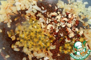 Итак, к луку добавляю содержимое маракуйи. Косточки будут приятно похрустывать, а мякоть придаст свежести и кислинки соусу.
