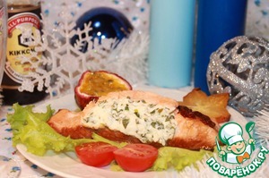 Накрываем стол, на листик салата укладываем фаршированного лосося, полить соусом, в котором тушились лососевые кармашки, рядом укладываем половинку маракуйи, если она была использована в приготовлении соуса, либо виноград, либо дольки мандарина, либо дольки апельсина. Я еще украсила карамболой. Ведь у нас праздник!!!