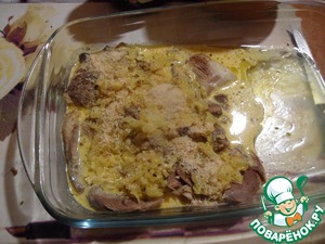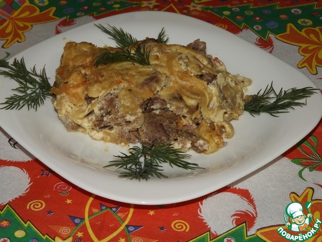 Смажьте сливочным маслом форму, выложите мясо, залейте сметаной с луком, посыпьте сухарями и запекайте в разогретой до 200 градусов духовке 15 минут.