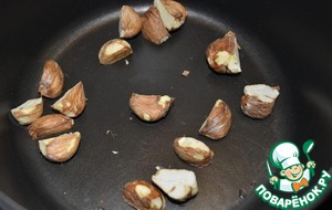 2. Каштаны очистить от внешней оболочки, разрезать пополам и слегка обжарить на среднем огне, без добавления масла (на сковороде с антипригарным покрытием) в течение 3 мин. -