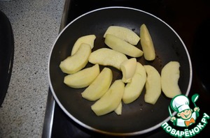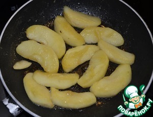 6. Кусочки яблок выложить на предварительно разогретую с небольшим количеством масла (я использовала сливочное) сковороду и слегка обжарить на маленьком огне (буквально 1 мин.), затем посыпать их 1 ст. л. сахара и оставить жарить на маленьком огне 2-3 мин. Аккуратно перевернуть, жарить еще 2-3 мин. В конце жарки добавить немного шампанского и немного чили-перца.