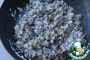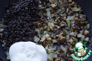 Грибы обжарить с половиной луковицы до готовности, добавить 0.5 стакана отварной чечевицы и сметану. Перемешать, посолить-поперчить по вкусу. -