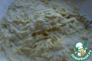 4 шт. крупного картофеля натереть на крупной терке, промыть водой, отжать. Добавить 2 яйца, полстакана кефира (или пару ложек сметаны), примерно 3 ст. л. муки.