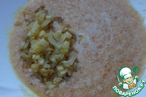 Тем временем поджариваем половину луковицы, чуть охлаждаем и добавляем к икре. Начинка №2 готова.