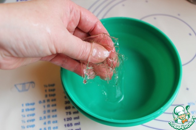 Займемся нашим желе. Берем белое вино. Нам понадобится еще пакетик сухого желе, прозрачного, рассчитанного на стакан жидкости.
