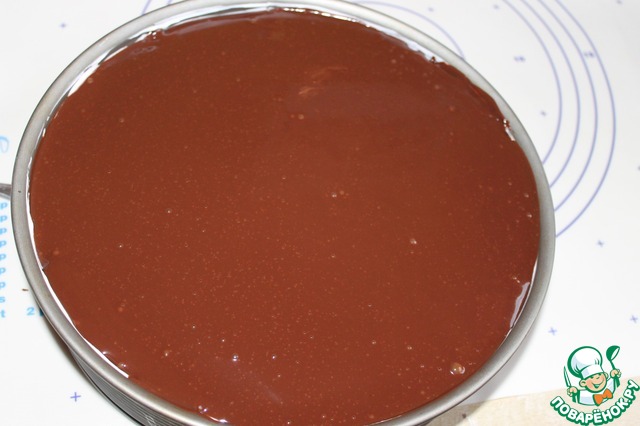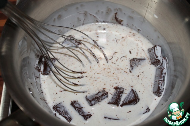 Делаем ганаш. Cливки разогреем. Добавим туда шоколад поломанный. Желатин-пластинку заранее зальем водой и добавим затем в шоколад. Все хорошо размешаем. Дадим немного остыть и выльем на наш тортик. Наклоняя его, даем ганашу растечься.