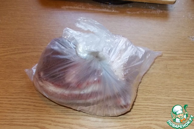 Оба куска кладем в один пакет, добавляем лавровый лист и завязываем узел, затем в другой, и так же - на узел. Получается пакет в пакете. (Важно, чтобы пакеты были цельные.)