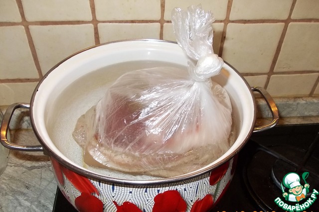 Опускаем в кипящую воду и варим на среднем огне 1 час при закрытой крышке. Пакет будет как поплавок. Ни в коем случае не прокалывать. Вода не должна попасть внутрь пакета.