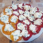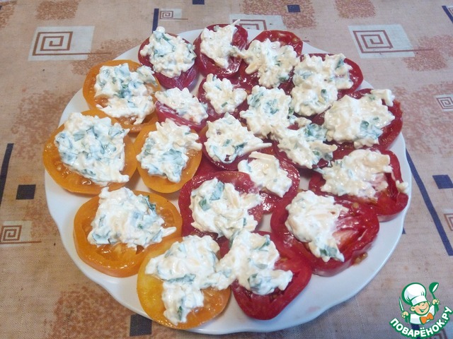 Начиняем помидорчики. Украшаем зеленью. Если они очень крупные, можно их порезать колечками, и на колечки выложить сырную массу. Приятного аппетита!