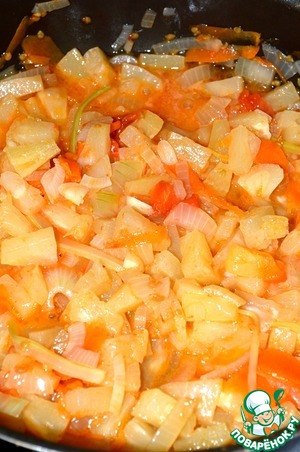 С ананасов слить сок, добавить ананасы в соус и продолжать тушить еще 5 минут