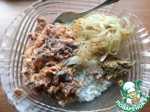 В посуду, где будем делать начинку, выкладываем уже остывший отварной рис 5 ст л, обжаренный лук, горчицу французскую, и рыбные консервы вместе с жидкостью (начинка будет не сухая, а очень нежная и сочная). Консервы размять вилкой, косточки выкинуть. Начинку перемешать