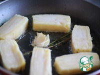 В это время в сковороду наливаем растительное масло, добавляем зубок раздавленного неочищенного чеснока и пару веточек свежего тимьяна. Разогреваем масло, придавая ему чесночный и тимьяновый вкус.