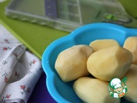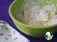 Можно натирать картофель в миску со сливками. Но мне было неудобно, (все зависит все-таки от терки), я натирала и сразу же опускала тертый картофель в сливки, чтоб он не успел окислиться и не потемнел. |