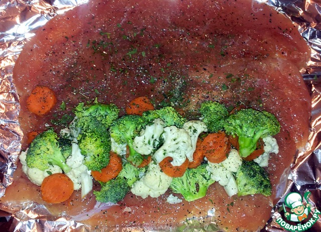 Филе сверху посолить и поперчить, посыпать зеленью. Капусту разделить на соцветия. Морковь нарезать кружочками и всё разложить на филе и полить маслом.