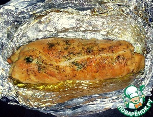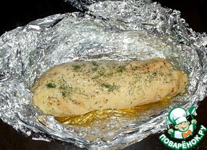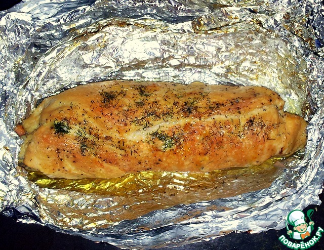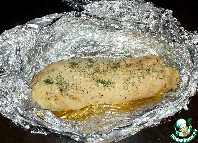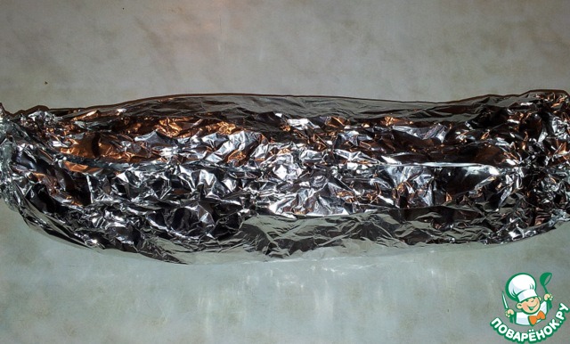 Рулет готов, но очень бледный. Освободим верхнюю часть от фольги и поставим минут на 7 под гриль.
