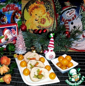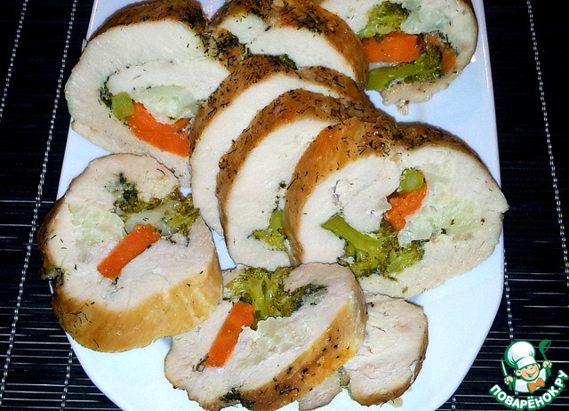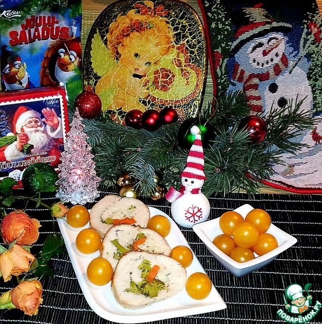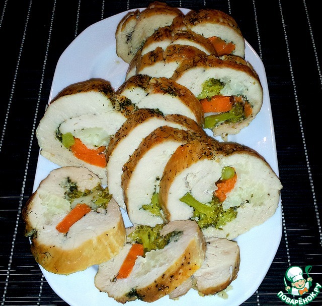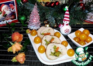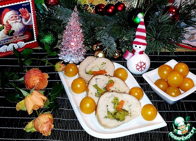 Рулет из индейки с цветной капустой и брокколи. Нежное мясо с сочными овощами. Вкусная закуска на праздничном столе.