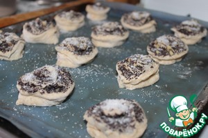 На противень стелем бумагу, или смазываем его маслом, выкладываем маковые кусочки, с одной стороны немного защипывая, формируем розочку. Сверху розочку можно ещё немного посыпать сахаром.