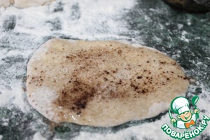Из второго куска теста, отщипываем небольшие шарики, раскатываем каждый в лепёшку, смазываем растительным маслом, посыпаем сахаром (обильно) и корицей.