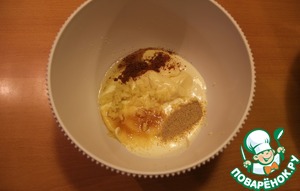 Соединяем молотый чеснок+сметана+майон ез+сок лимонный+сахар+соль +специи.