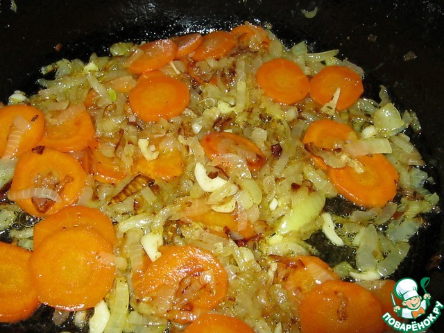 Лук шинкуем полукольцами или кубиком, морковь - кружком или натираем на тёрке - кто как любит. Обжариваем на растительном масле до готовности, Добавляем рубленый чеснок (можно продавить через пресс).