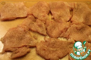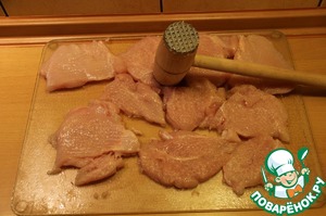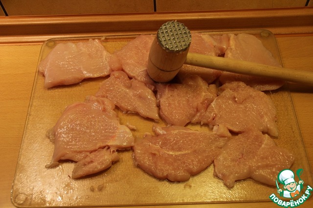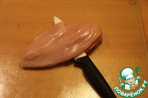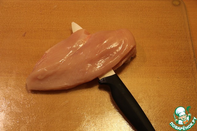 Придавливая рукой, куриное филе разрезаем вдоль.