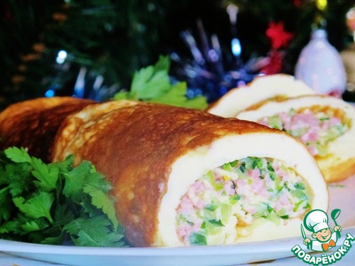 На край омлета аккуратно выложить салат и свернуть так, чтобы шов оказался внизу.