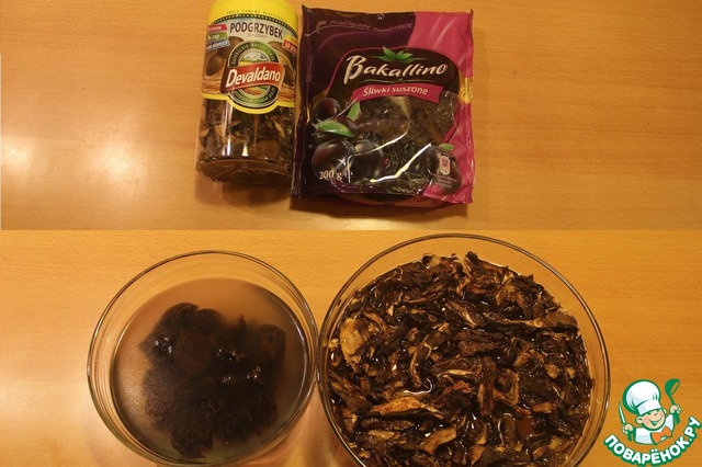 Грибы и сливы замачиваем на ночь в воде. Потом отвариваем грибы в той же воде около 30 минут. Сливаем воду в посуду, она пойдёт на бигос.