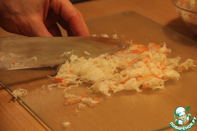 Квашеную капусту мелко нарезаем, белокочанную шинкуем.
