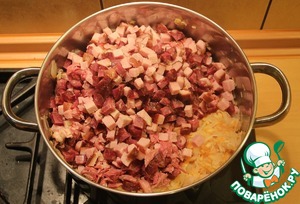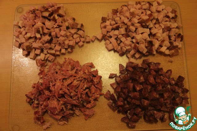 - Колбаса (копчёная, лучше из дикого кaбана, но можно и просто охотничью) — 250 г