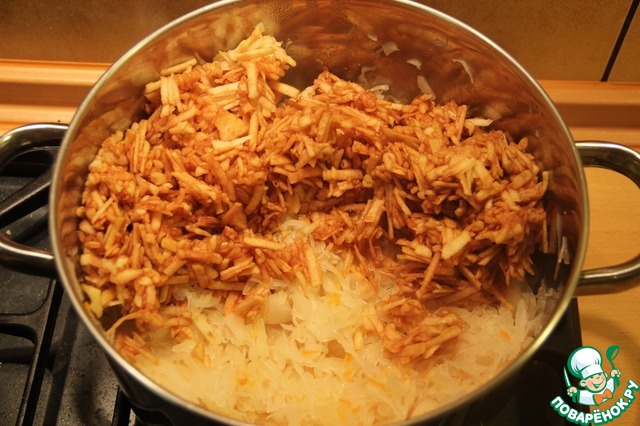 После 45 минут варки капусты добавляем тёртые яблоки и хорошо перемешиваем.