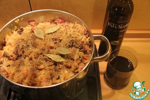 На следующий день в 250 г закипевшей воды добавляем 50 г вина и выливаем в бигос, мешая, доводим до кипения и варим на малом огне около 10 минут, мешая, чтобы не подгoрело.