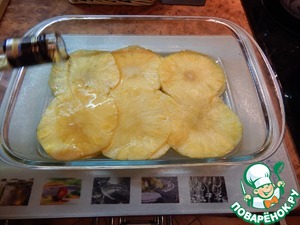 Пласты ананаса выкладываем в плоское блюдо, заливаем коньяком.
