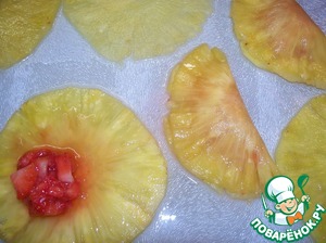 Выкладываем ананасы на доску. Внутрь каждого выкладываем начинку и прижимаем края.