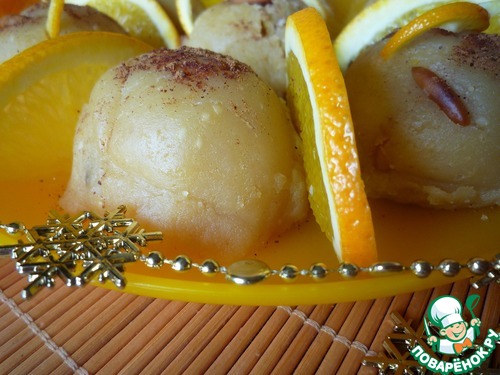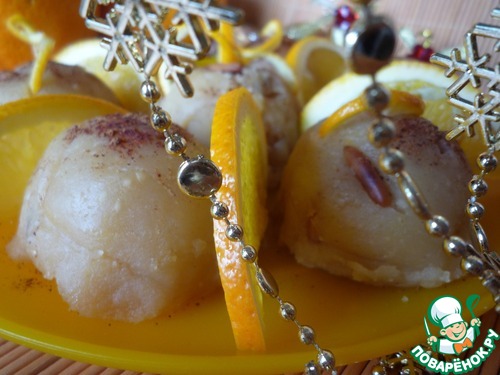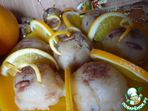 Режем на дольки апельсин, выкладываем между шарами. Посыпаем корицей, украшаем апельсиновым "серпантином". Из оставшегося апельсина выжимаем сок прямо на десерт.