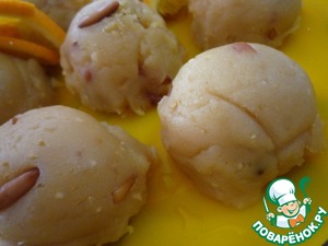 С помощью ложки для мороженого (или обычной столовой ложки, но при этом помогаем себе руками) формируем шарики. Шары выкладываем на тарелку. Из этого числа продуктов получится примерно 14 шаров.