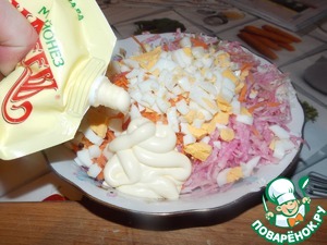 Затем все перемешиваем и добавляем не больше 1ой ст. ложки майонеза.. Если добавить больше, будет очень жирно.. И так же я не солила салат, так как он с добавлением майонеза (вы по желанию можете посолить)