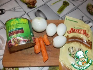 Ингредиенты для салата из фасоли... Для него нам понадобятся 1 банка консервированной фасоли в собственном соку, 3 яйца, 1 луковица, 1 морковка (у меня было 3 мелких, но их можно считать как за 1 среднюю морковку) и майонез.