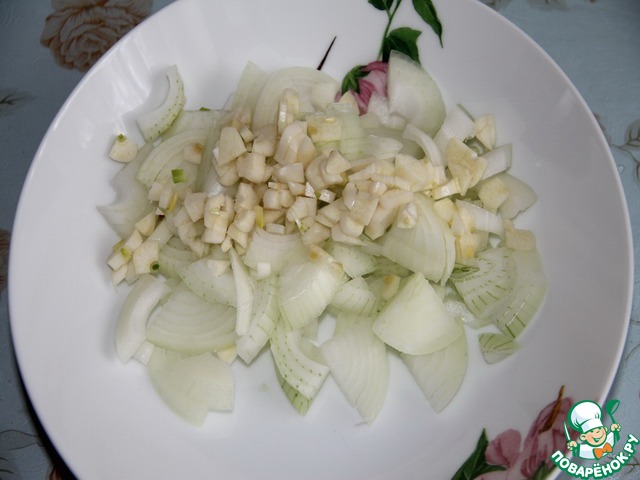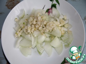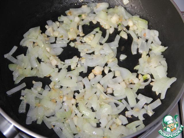 • Разогрейте на большой сковороде масло, положите корицу и быстро обжарьте (я корицу не клала, так как мы ее не любим). Добавьте лук, чеснок, немного обжарьте.