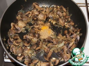 • Положите в сковороду с луком грибы, обжарьте 3-4 минуты. Добавьте кориандр, тмин, куркуму.