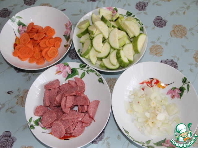 Морковь нарежьте тонкими кружочками, кабачок и колбасу половинками кружочков. Нарежьте лук и чеснок.