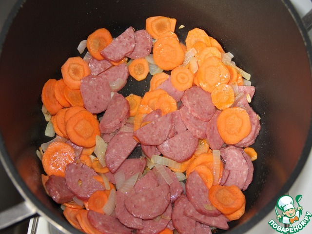 В большой кастрюле разогрейте растительное масло и обжарьте лук с чесноком, положите морковь, колбасу, жарьте 2 минуты.