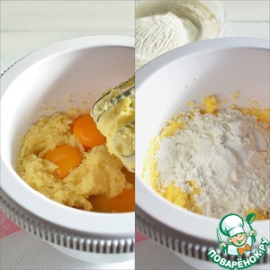 Заранее достать из холодильника сливочное масло, чтобы оно стало мягким. Добавить к нему сахар, ванильный сахар и взбить до пышности. Отделить желтки от белков (белки нам не понадобятся), добавить к масляной массе, так же влить коньяк и все еще раз взбить. Всыпать крахмал и перемешать. Добавить порциями просеянную муку с разрыхлителем. Добавлять нужно частями, потому что мука бывает разной, и возможно потребуется не вся.