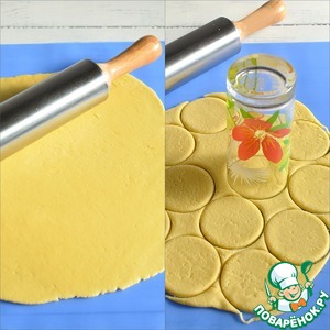 Отделить от общего куска теста 1/3 часть и раскатать в тонкий пласт толщиной 4 мм. С тестом легко работать на силиконовом коврике. При раскатке я не припыляла мукой. Вырубить стаканом круги. Тоже проделать с оставшимся тестом. Должно получиться 60 шт. кружочков. Выход готового печенья 30 шт.